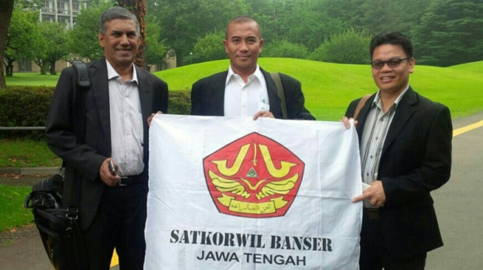 Bendera banser dikibarkan bersama oleh Hasyim Asy’ari, Ph.D. (Diponegoro University, Indonesia, yang juga Kasatkorwil Banser Jawa Tengah); Prof. Joseph M. Fernando, Ph.D. (University of Malaya, Malaysia); Prof. Tsuboi Yuji, Ph.D. (Tokyo University for Foreign Studies, Japan); dan Saimin Ginsari, Ph.D. (University of Malaya, Malaysia), Sabtu 2 Juli 2016.