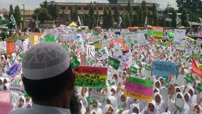 Ribuan santri memenuhi lapangan Pondok Pesantren Darussalam Blokagung Banyuwangi menyaksikan pelepasan Kirab Hari Santri Nasional 2016 (santrinews.com/ist)