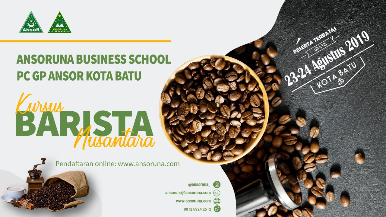 Ansoruna Business School kembali akan menggelar Kursus Barista Nusantara. Kegiatan ini hasil kerajsama dengan PC GP Ansor Kota Batu.