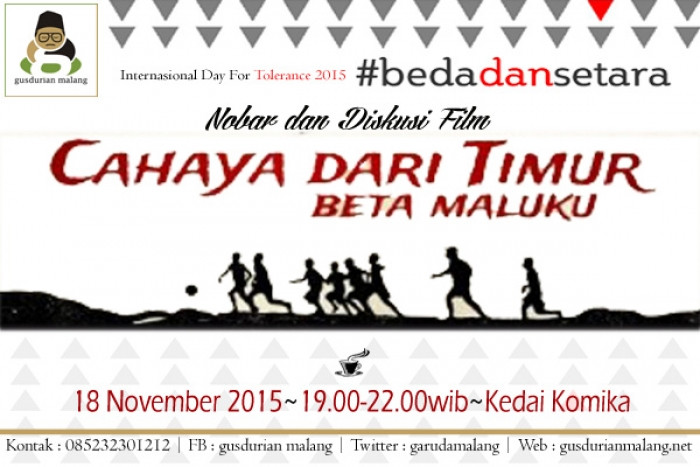 Judul dan tema film sengaja telah dipersiapkan langsung melalui Sekretariat Nasional Jaringan Gusdurian yang akan diagendakan serentak oleh 50 komunitas di berbagai daerah mulai tanggal 16-20 November, seperti film Cahaya Dari Timur: (Beta Maluku), film besutan sutradara Angga Dwimas Sasongko ini yang akan di putar oleh Gusdurian Malang, pada 18 November 2015 nanti bertempat di Kedai Komika.