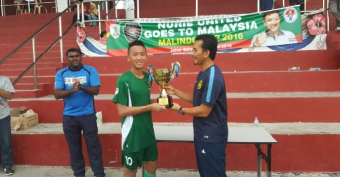 Kapten Nuris United FC, Richard Rachmad menerima piala Malindo Cup 2016 (santrinews.com/ist)